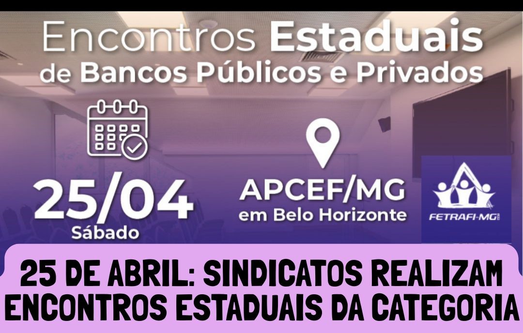 Bancárias e bancários de Minas Gerais se reúnem na APCEF/MG em 25 de abril para Encontros Estaduais por bancos (CAIXA, BB, Itaú, Bradesco, Santander, Mercantil e Inter).