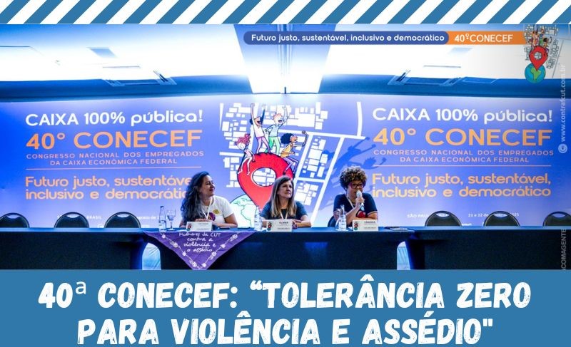 As empregadas da Caixa Econômica Federal abriram as atividades do 40º Congresso Nacional das Empregadas e Empregados da Caixa, nesta quinta (21), com um manifesto da Contraf-CUT, do Comando Nacional dos Bancários, das Federações e Sindicatos por “Tolerância zero para casos de violência e assédio”. A leitura do manifesto foi realizada logo na abertura, antes do debate e aprovação do regimento interno do Congresso.