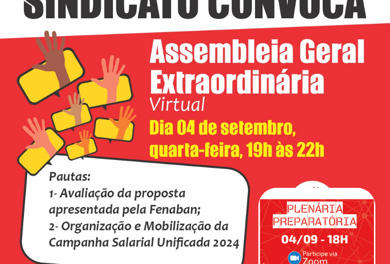 O Sindicato dos Bancários de Uberaba e região convoca todos os bancários e bancárias de bancos públicos e privados de sua base para a assembleia geral online, que será realizada das 20h00 do dia 04 de setembro às 20h00 do dia 05 de setembro, na plataforma Vota Bem (https://bancarios.votabem.com.br/).A assembleia será precedida de uma plenária…