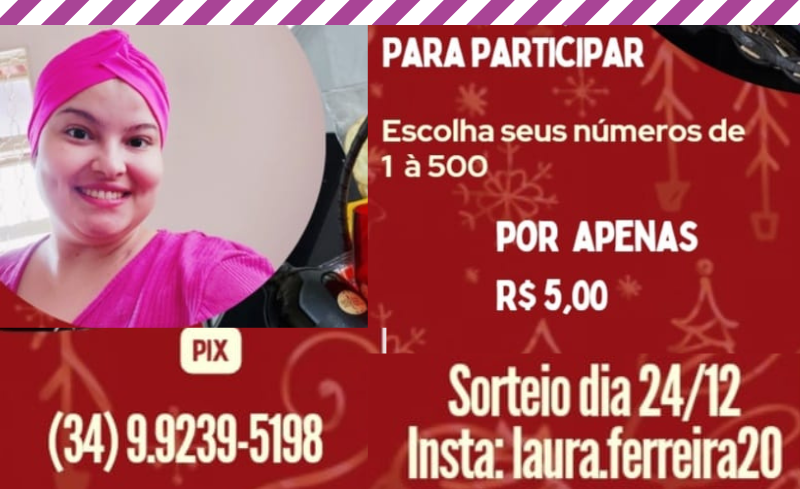 Para arrecadar valores que auxiliam nas despesas, ela está promovendo uma rifa de Cesta de Natal, com números que vão de 1 a 500. Todos que puderem participar deve entrar em contato com ela pelo WhatsApp (34) 99239-5198, ou pelo seu Instagram @laura.ferreira20