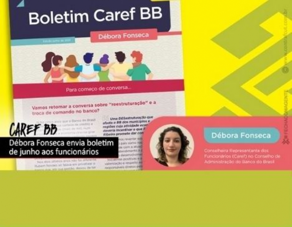 A Conselheira Representante dos Funcionários (Caref) no Conselho de Administração do Banco do Brasil, Débora Fonseca, lançou nesta semana a edição de junho do seu boletim eletrônico. Nesta segunda edição, ela traz reflexões sobre a reestruturação e a mudança de comando do banco. Acesse na íntegra aqui.