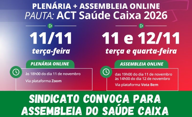 O Sindicato dos Bancários de Uberaba e região convoca todos os bancários e bancárias beneficiários titulares do Saúde Caixa, sócios e não sócios, da sua base que prestam serviço para a Caixa Econômica Federal, para assembleia online específica, das 19h do dia 11 de novembro de 2025 até às 14h do dia 12 de novembro de 2025, para deliberação da seguinte pauta: Aprovação do Acordo Coletivo de Trabalho Saúde Caixa 2026 com vigência de 1º de janeiro de 2026 a 31 de agosto de 2026. Antes da assembleia, haverá uma plenária, a ser realizada no dia 11 de novembro de 2025, de forma virtual, por meio da plataforma Zoom, com início às 18h. É importante a participação de todos.